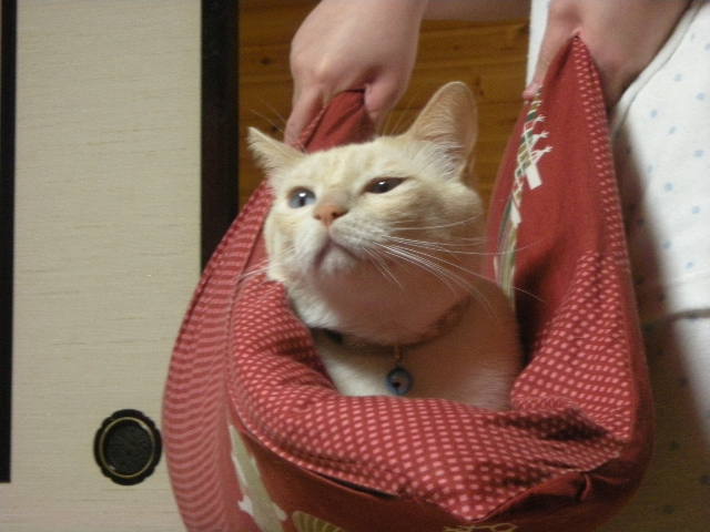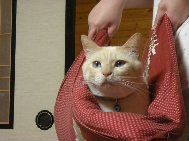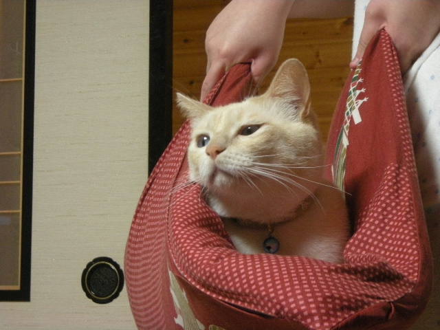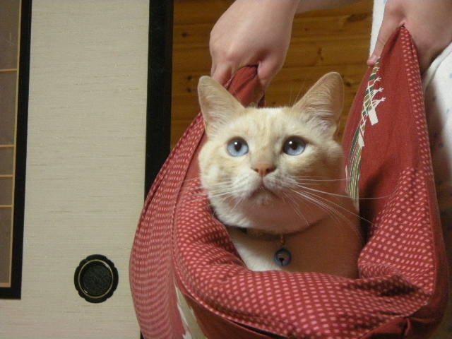 座布団ごと娘に持ち上げられて、おとなしく周りを眺める乗りのいいモカです。