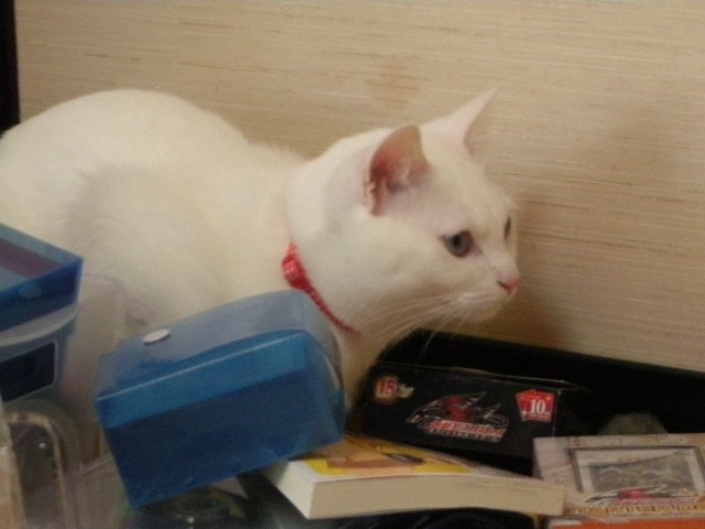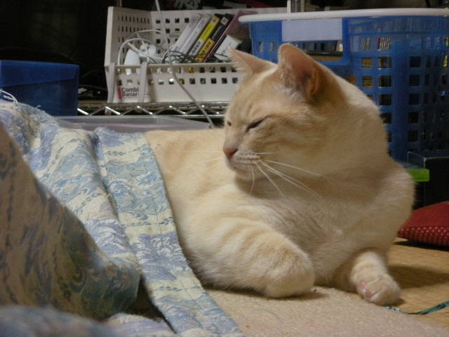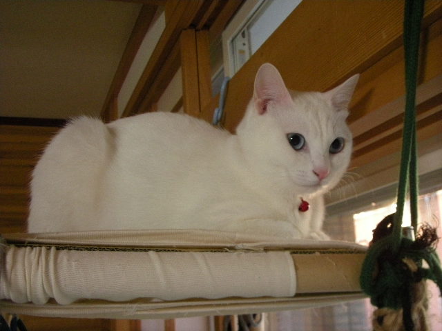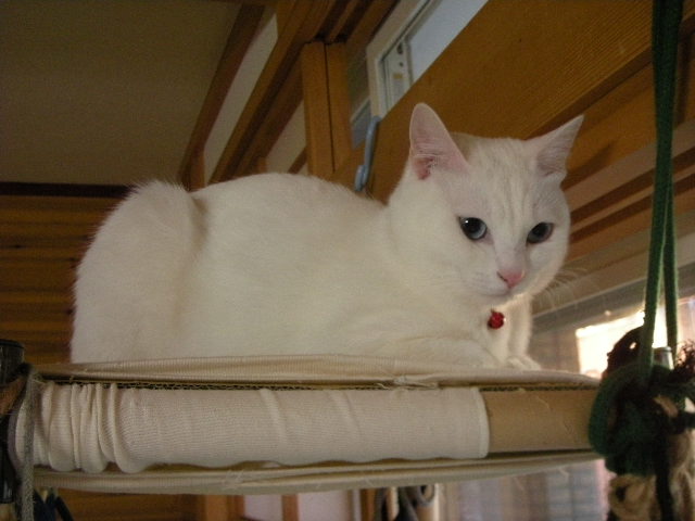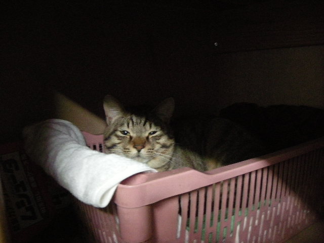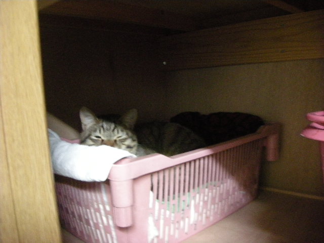 クロゼットの棚の上で、最初は困ったことに服の中に寝ていたので、オークのためにベッドを用意したらお気に入りになりました。