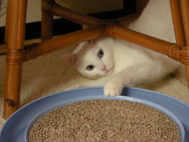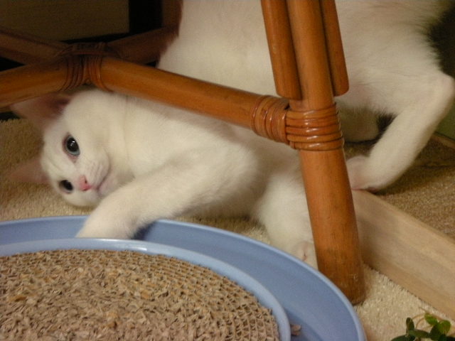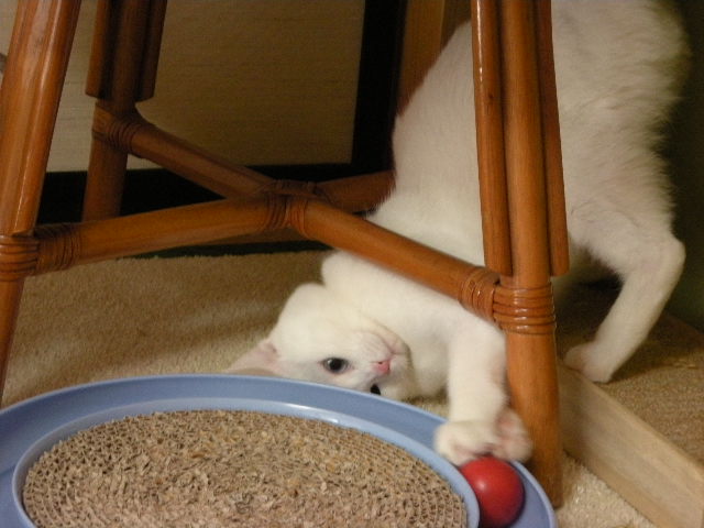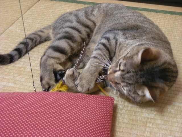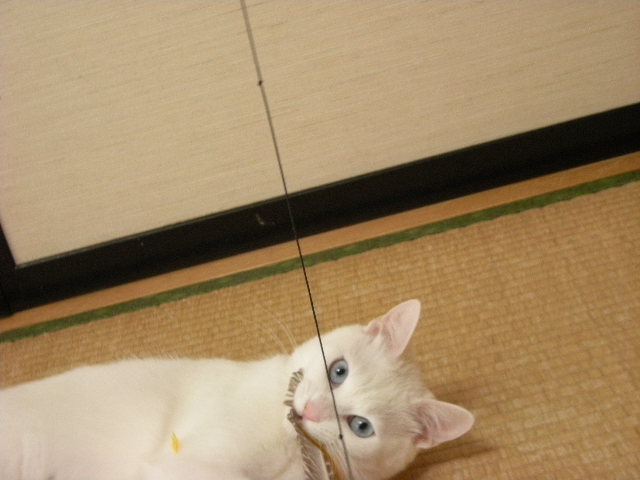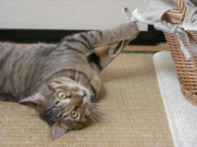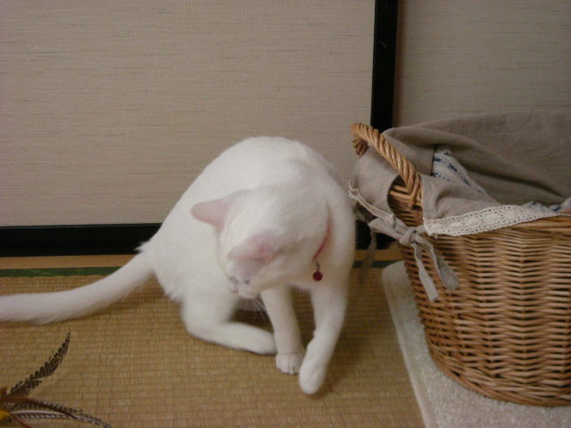 勢い余って籠のひもにじゃれる