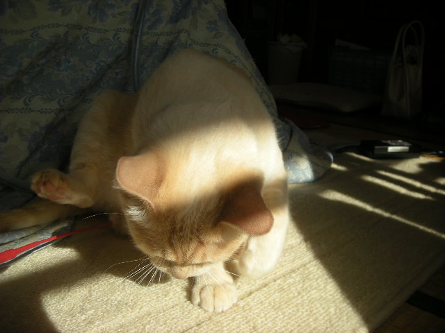 今はお行儀悪くテーブルにのったり