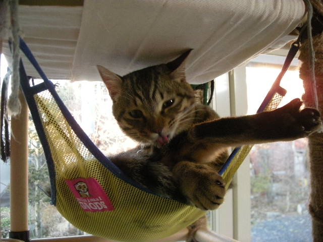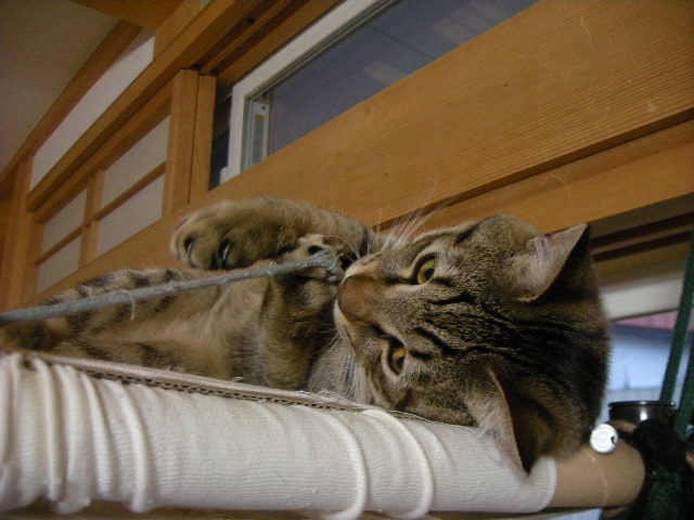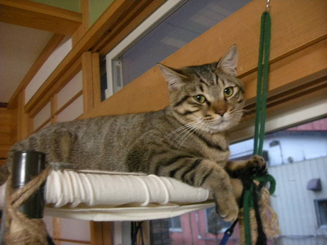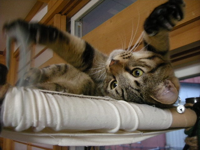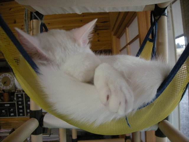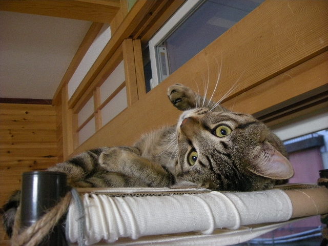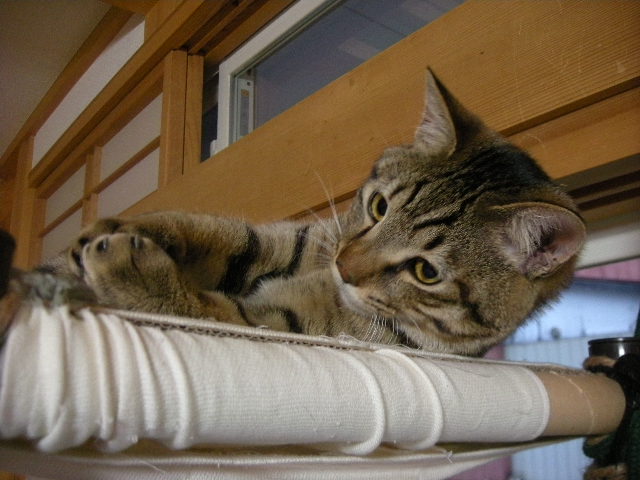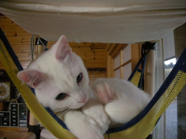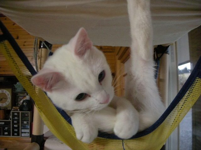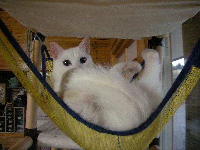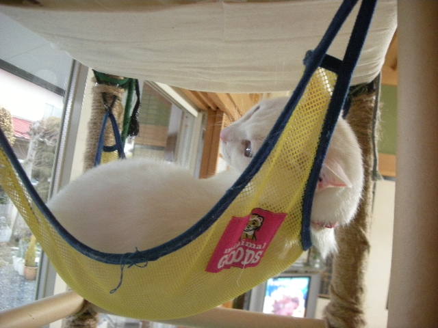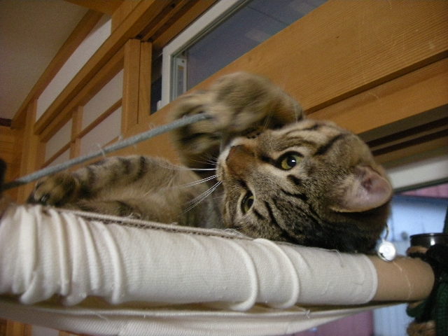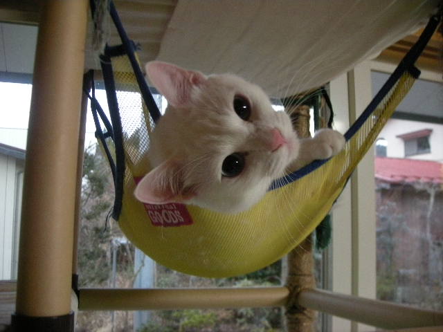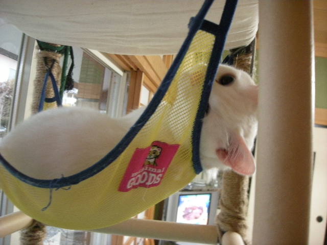 さて、アクアもオークもハンモックが大好き。特に寒くなってからは、暖かい空気を求めて高いところにいます。