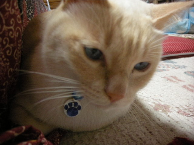 モカはぶら下がるものを嫌がらないので、大きめ。裏に名前と電話番号が書いてあります。