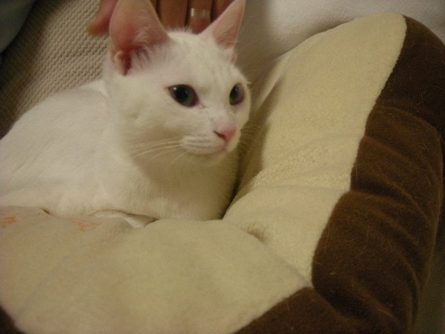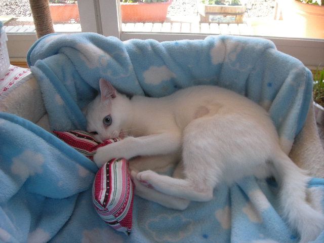 オークと兄妹。いつか白で碧眼の子をと願っていた娘が里親募集のサイトで見つけた子。うちに来たときには真っ白だったが、麿眉が発現。