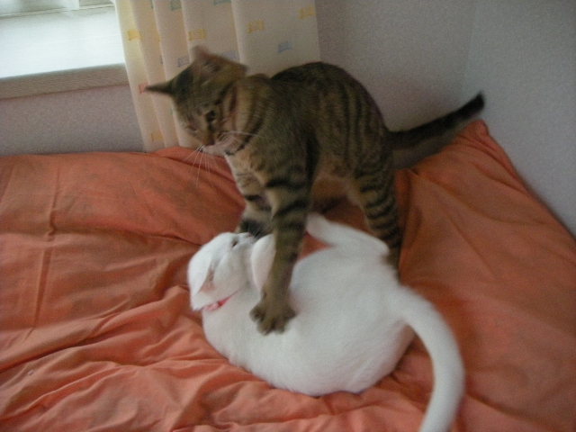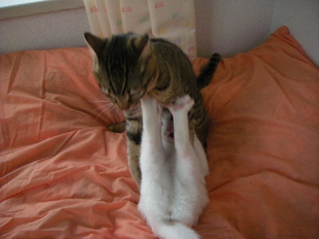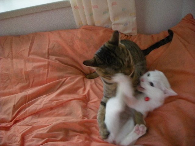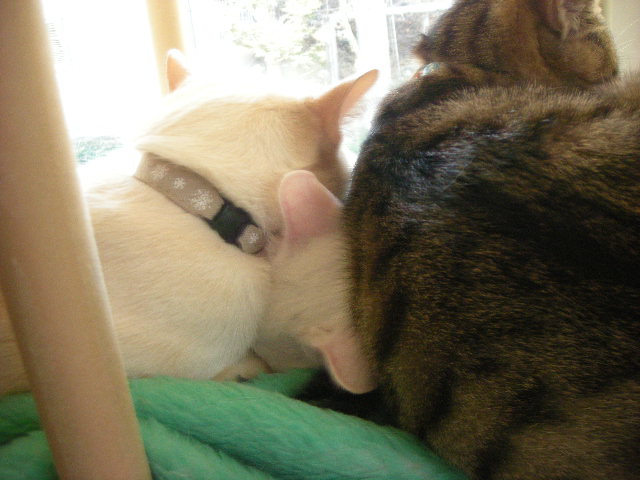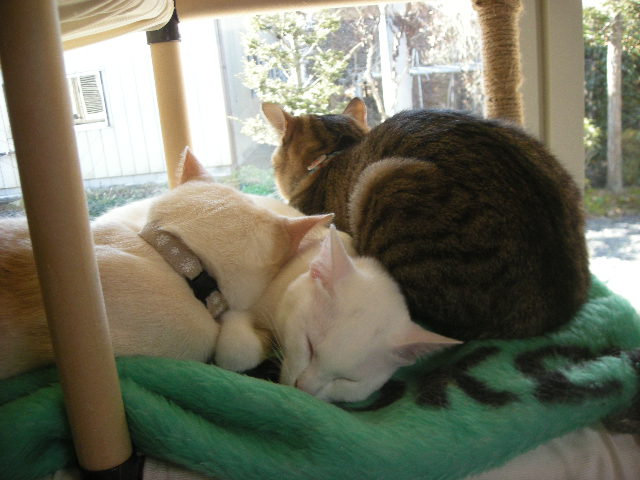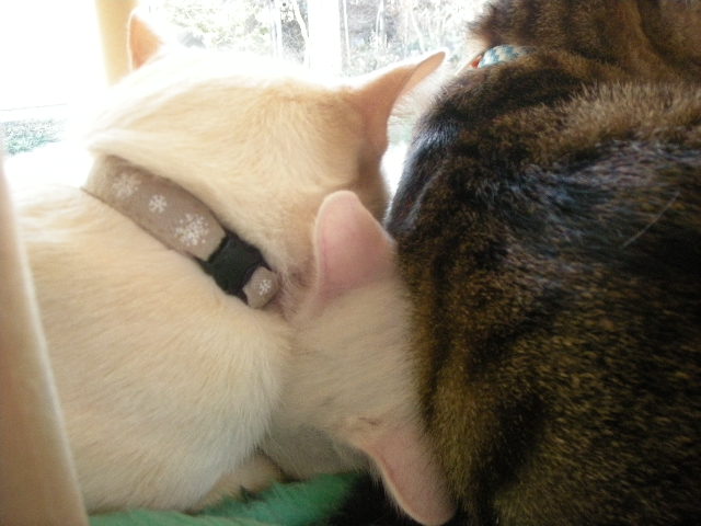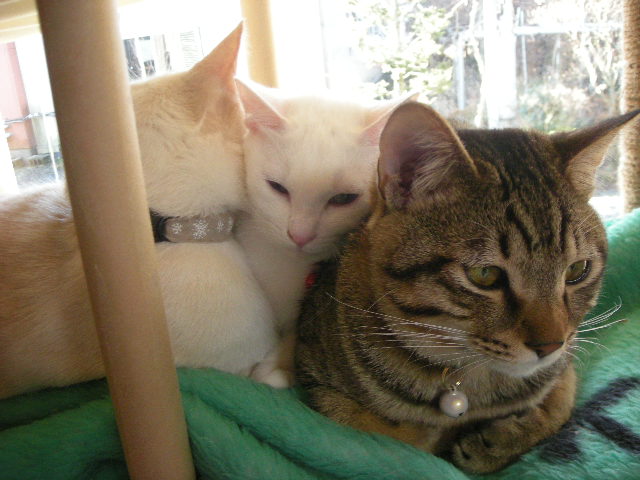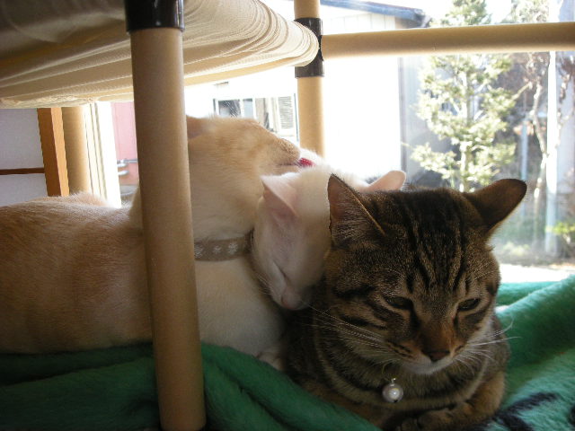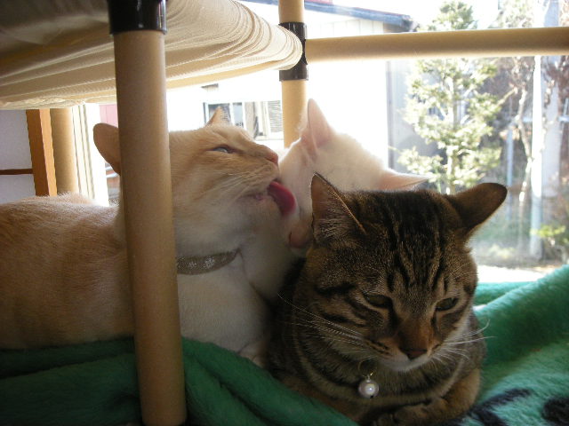 無理矢理なアクアですが、3匹の方が暖かいのか、毛繕いの挨拶を交わしながら割り込んでいきます。
