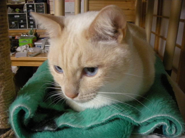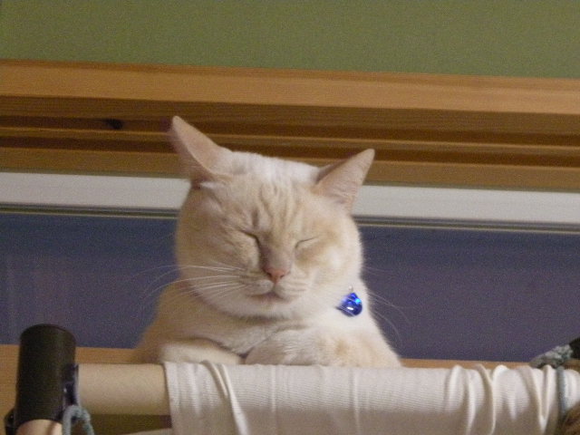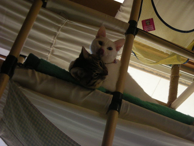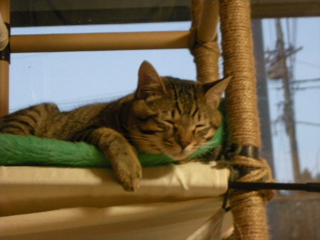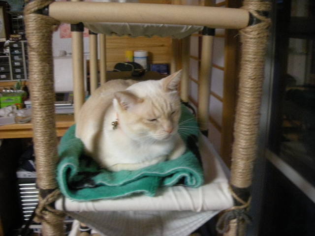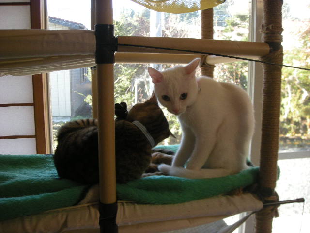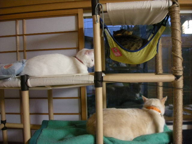 おかげさまでモカタワーは人気スポット。休むときはここかこたつか。