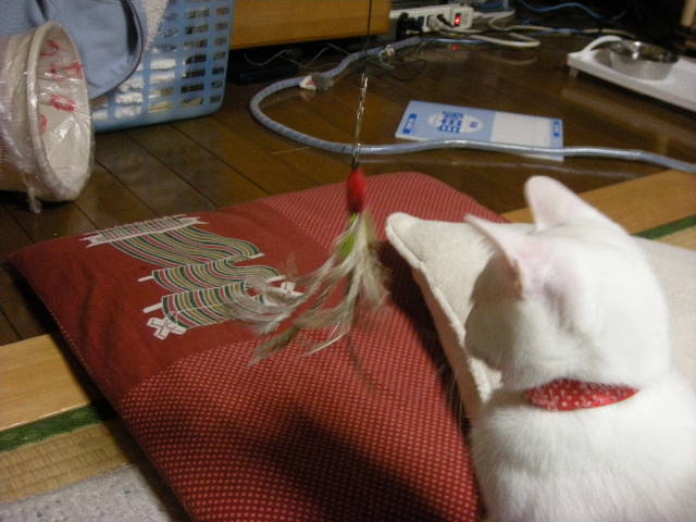 この猫じゃらし、バードオンスティックと言うんですが、本当に好きです。こちらは座ったままでひゅんひゅんふりまわすだけですから楽です。
