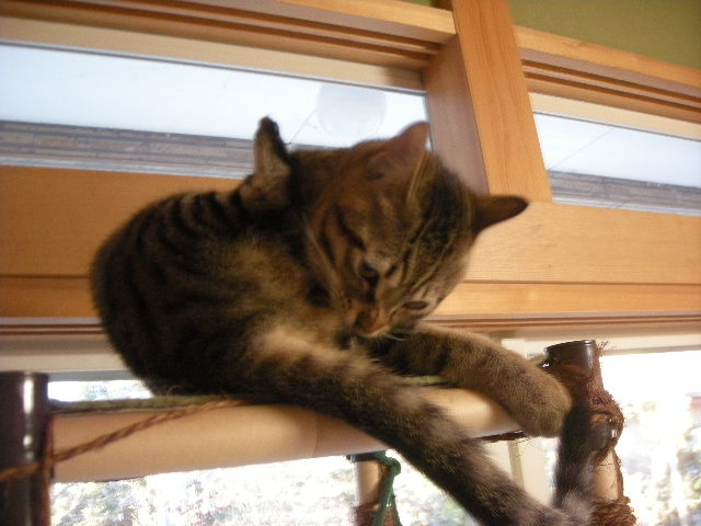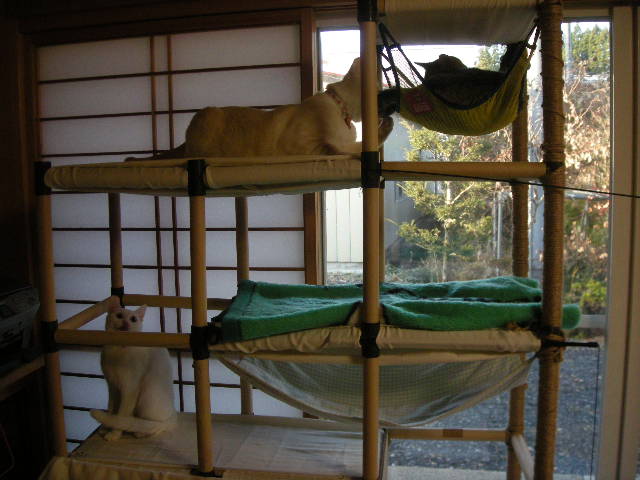 がたつくことも、はずれることもないんですが、頑丈にしようと巻いた縄がいいおもちゃになってしまいはずれはじめました。縄をまき直しても数ヶ月ではずされてしまうでしょうから、他の方法で補強しなくてはなりません。