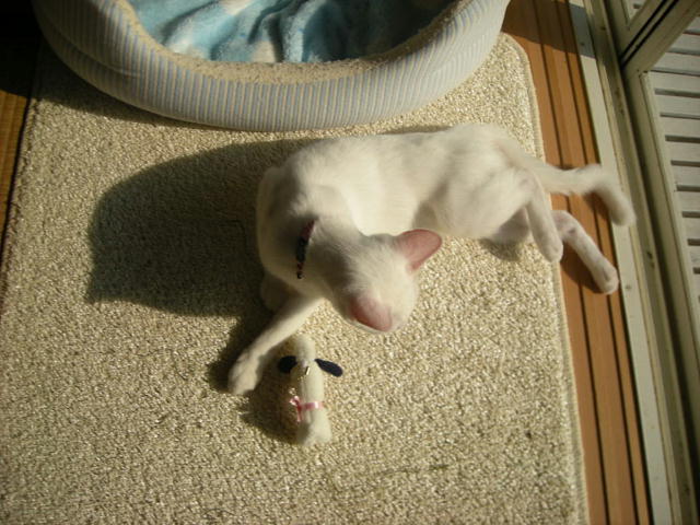 オークと兄妹。いつか白で碧眼の子をと願っていた娘が里親募集のサイトで見つけた子。うちに来たときには真っ白だったが、麿眉が発現。