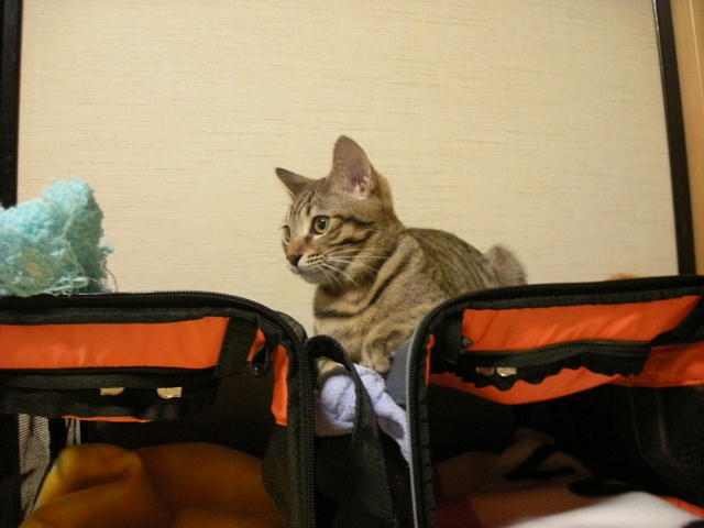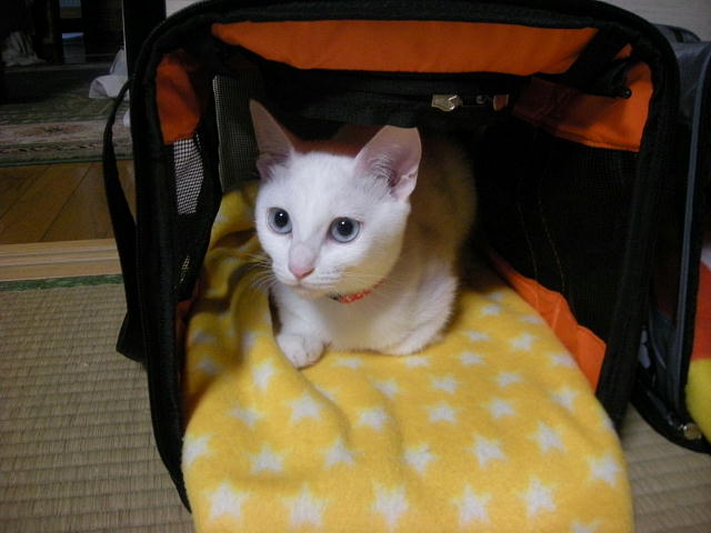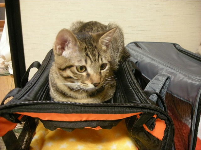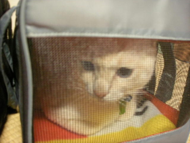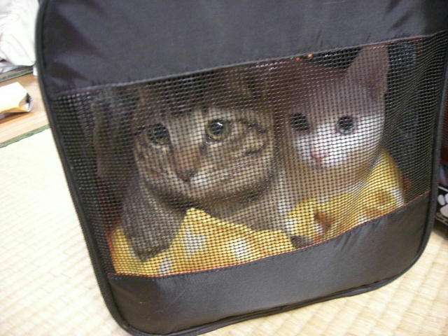 以前はもう一つのプラスチックのキャリアケースにちびっ子ペアを入れて運んだんですが、今回2匹入れるかどうか……。
