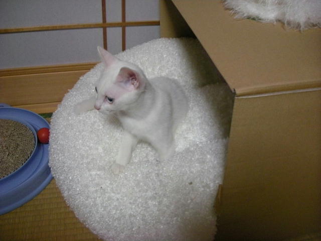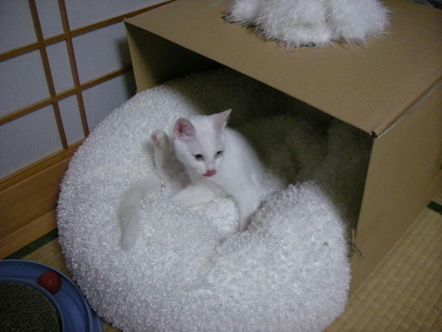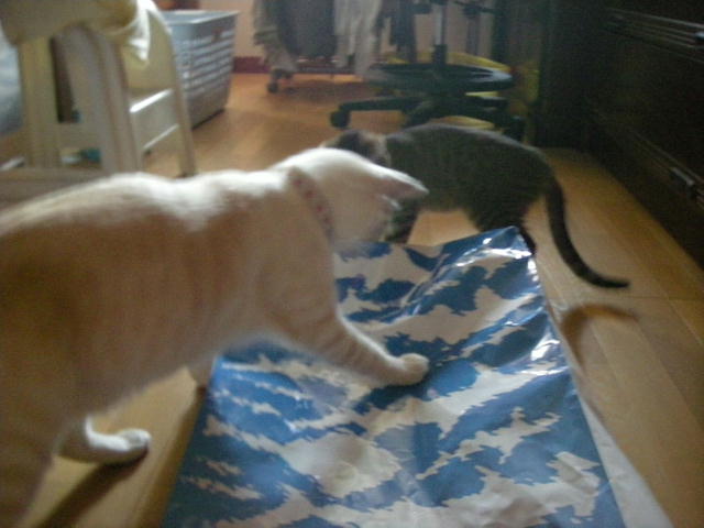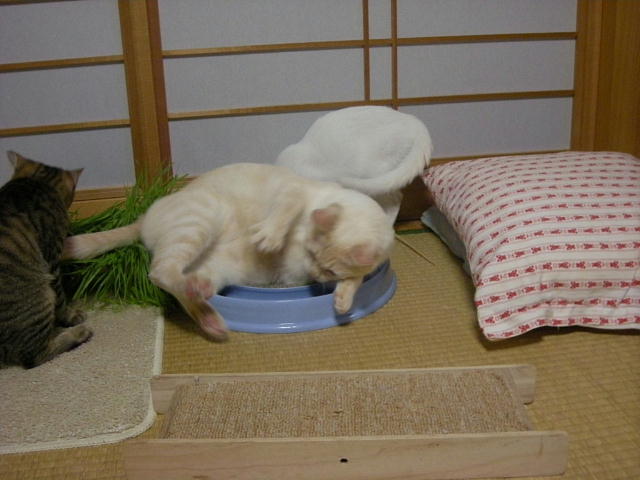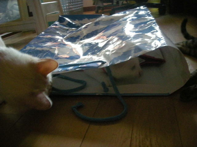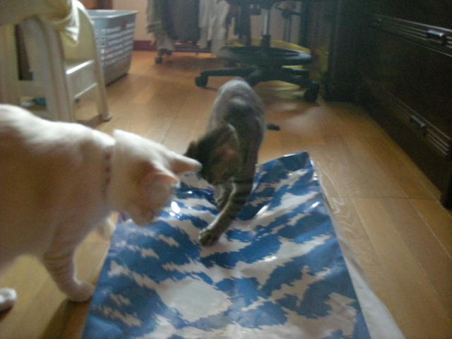 我が家のご飯はピュリナワンなのだけれど、ちょっと気が変わって仔猫たちのご飯を「にゃいにぇんにゅにゃいにぇにょ」に変えたら、食べない。袋の口が開いたまま、スーパーの袋にちょいっと包んで、他の買い置きの餌と一緒に引き出しに入れておいのを、モカが持ち出したらしい。