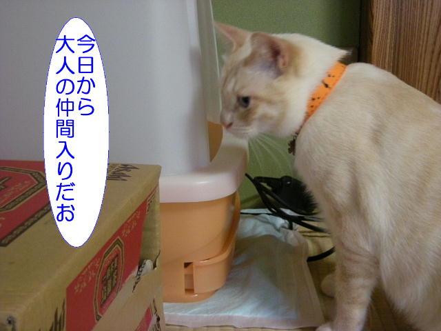 モカちゃんのダイエットのために常備の仔猫の餌を、仔猫しか入れないスペースに入れてみました。オークちゃんはすっぽり入り込みますが、アクアちゃんは首だけ。