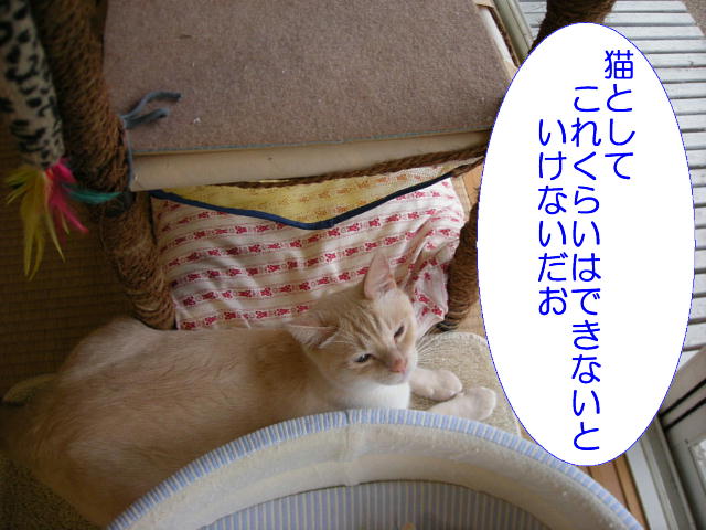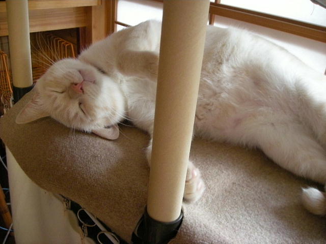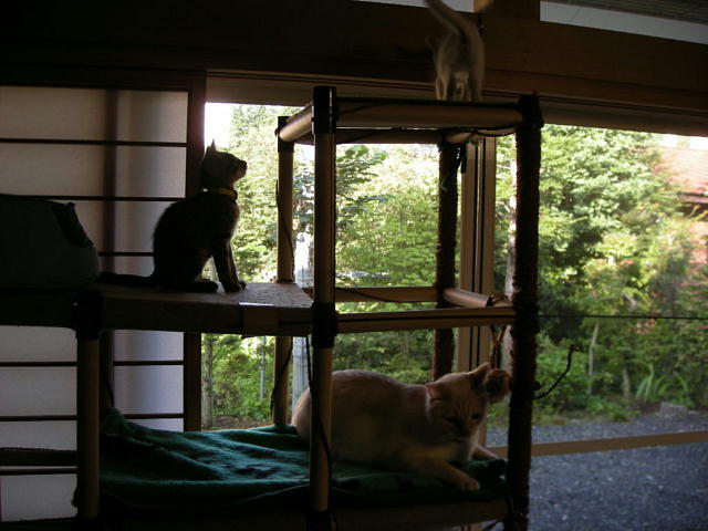 その時もかはどうしているかというと、タワーの途中や下で見ています。この場所に3匹、一緒に登ったらさすがに狭いです。
