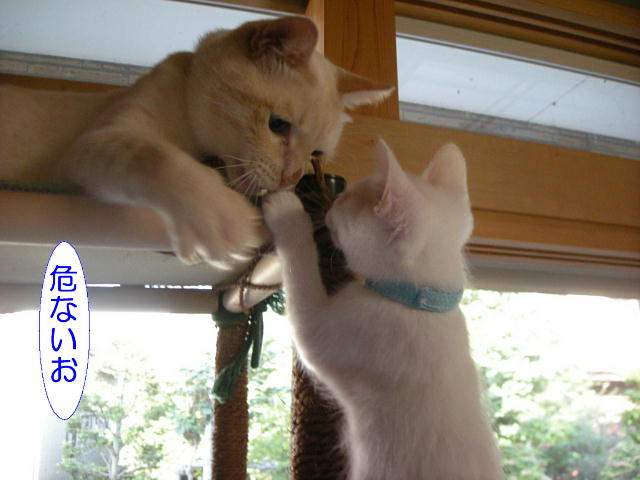 細い足場でじゃれるので、見ている方がはらはらしますが、落ちることもなく遊んでいます。