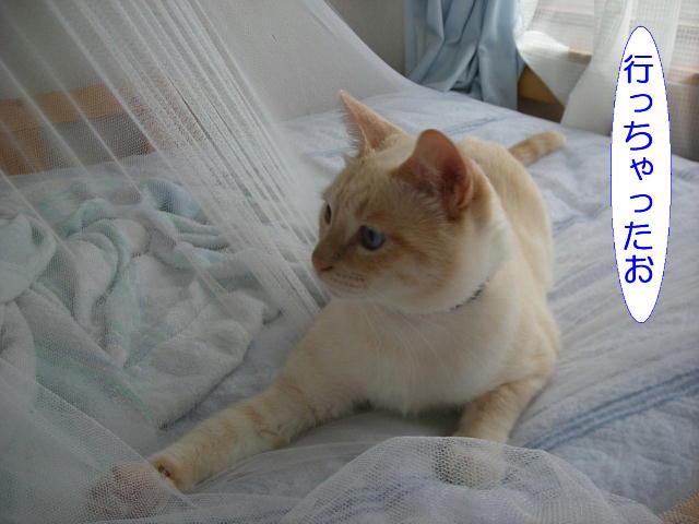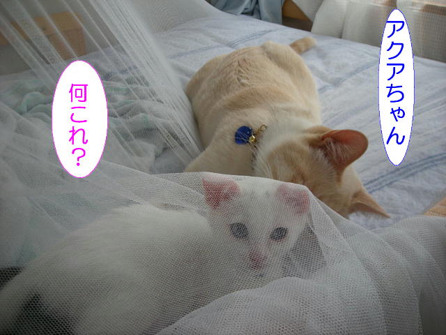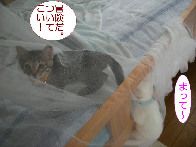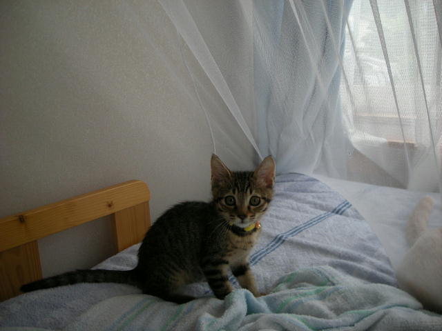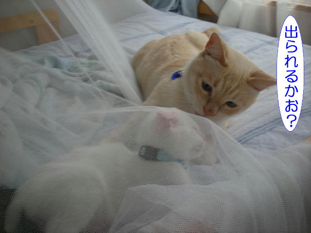 前にも書きましたが、娘のベッドは蚊帳代わりの天涯付きなのですが、これがベッドに寝たままカーテンにじゃれられるという人気スポット。