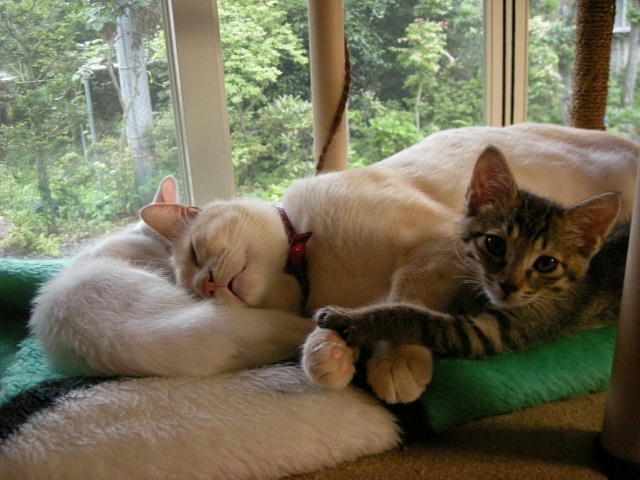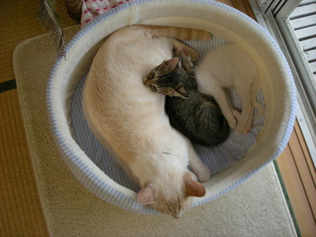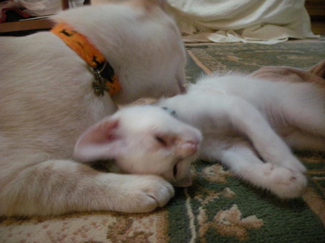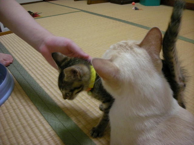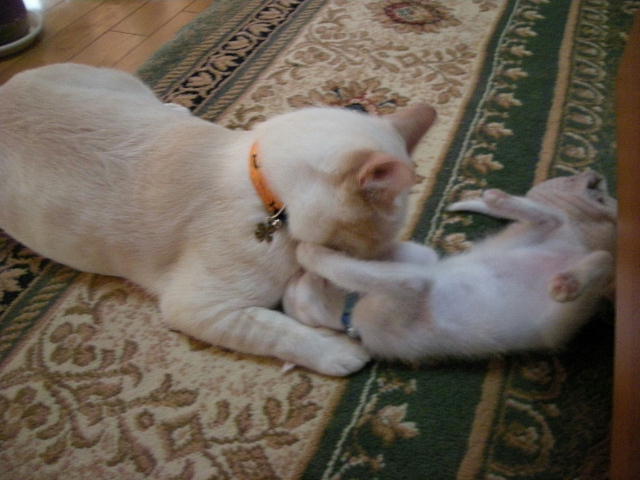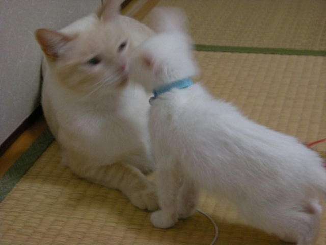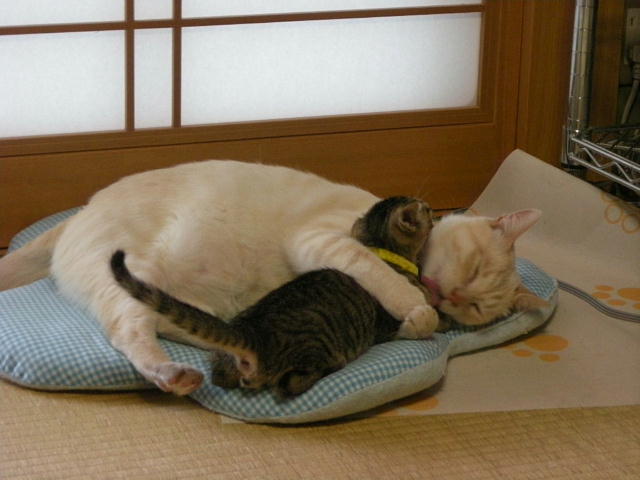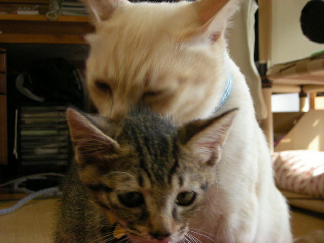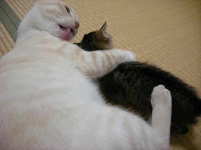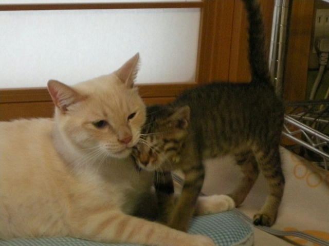 丹念になめてあげていますし、オークちゃんもモカ兄ちゃんスリスリなので大丈夫かと思いますが、モカが自分が上位であることを教えているんでしょうか?