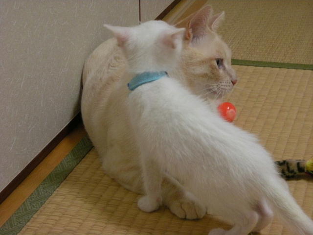 さて、べたべたにかわいがっているように見えたオークちゃんですが、今朝から首筋をかんで押さえつけるようになりました。