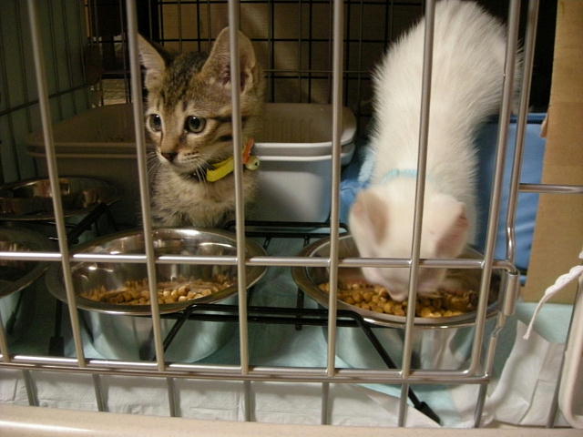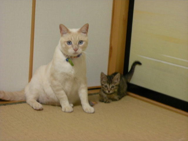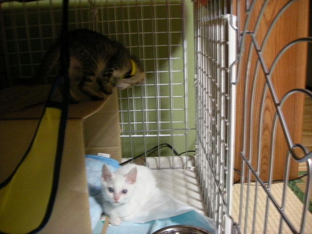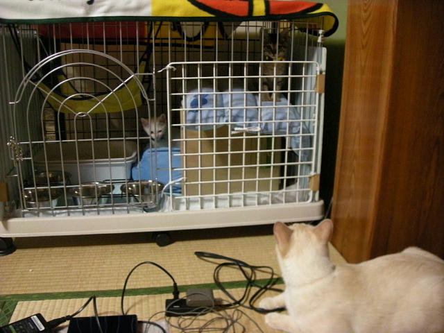 一緒についてきたモカを閉め出すのもかわいそうで、いざとなったら身を挺して仔猫を守るつもりで一緒に入れてみる。