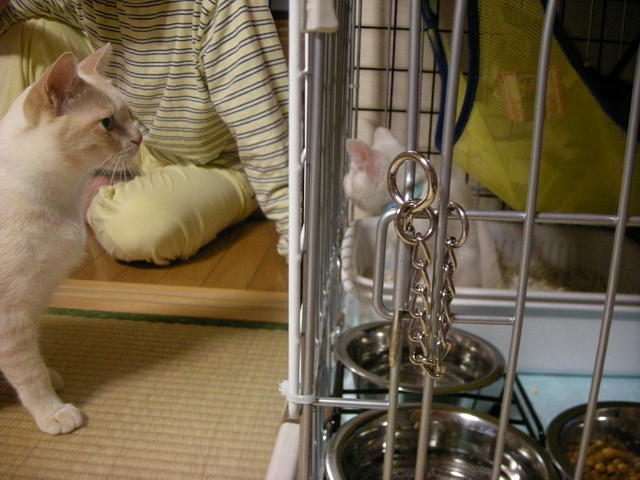 オークがゲージの隙間から手を出すと、モカがその手を軽く叩くと言う遊びを始めました。アクアはそんなオークのしっぽにじゃれているだけで、モカにはまだ興味がない様子。