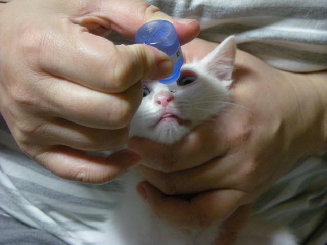 アクアちゃんの左目は真っ赤っかです。今朝も目薬をつけるまで目やにで開かないような状態。