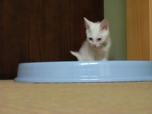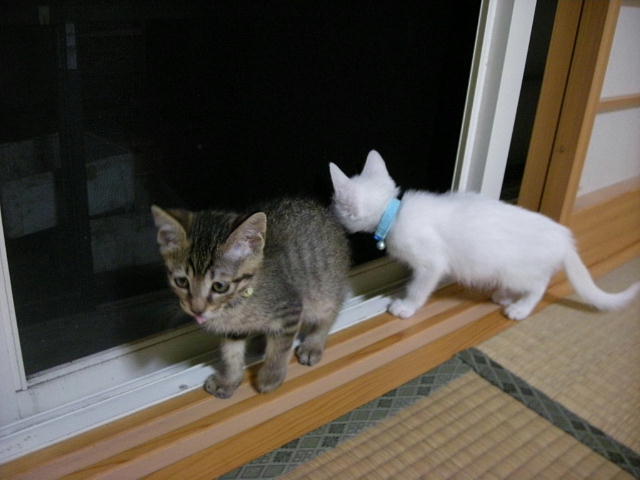 まだアクアの方が警戒が解けていないみたいで、モカはにおいをかぎに近寄っては後ずさりすると言うことを繰り返していました。
