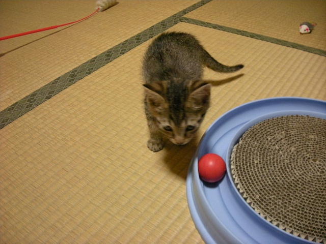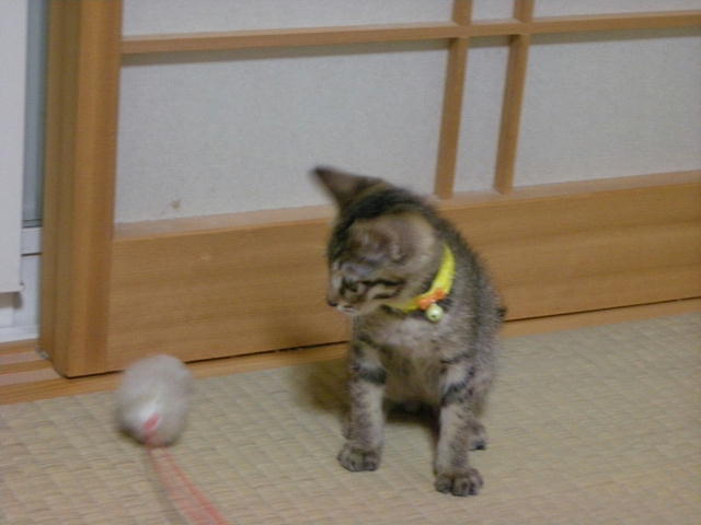 仔猫たちをゲージに戻してから遊んだら、いつも寝ころんでしまう猫じゃらしに華麗なジャンプを決めました。いい刺激になっているみたいですね。