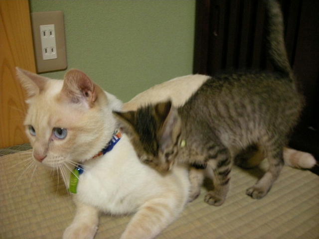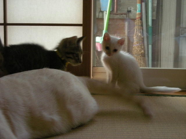 夕べ、隠れるのに飽きてしまった子猫たちが遊び始めると、モカも少しずつ近づいて行きました。