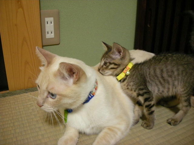 アクアちゃんもオークちゃんも、モカと鼻チュウの挨拶をすませました。人間には寄ってきてくれませんので、どうやら人間より猫同士の方が早く仲良くなりそうです。