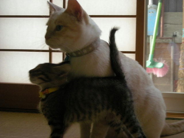 アクアちゃんも少しずつ近づいていくようになりました。モカも静かにしっぽで遊ばせたり。