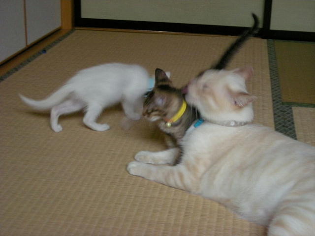 モカもなめ返しているので、この二人の関係はもう安心。オークのコクシジウムがあるのでおしりをなめないように警戒しながらの初接触になりました。