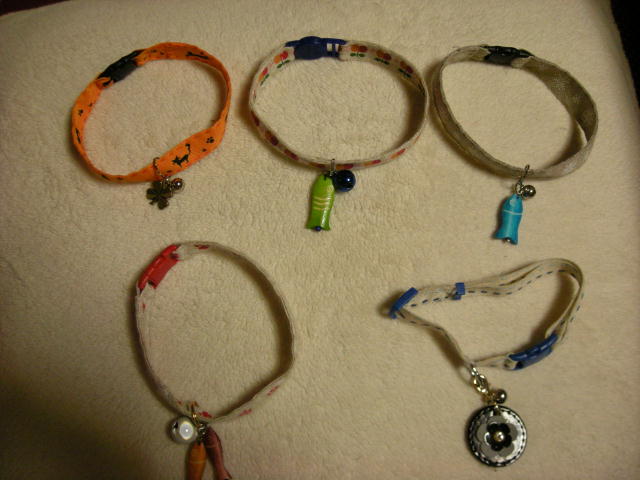 モカはもうこれ以上大きくならないはずで、長さの調節もいらないのでとても簡単です。50センチのリボンを二つ折りにして縫い合わせるだけ。またはげてはかわいそうなので、少しゆるめに作ってあります。ジョイントは6個で500円しませんでした。