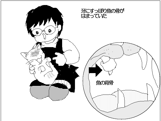様子がおかしいので無理に抱き上げて口の中を見たら、魚の背骨が牙にすっぽりはまってはずれなくなっていました。それからゴミ箱にはふたをしています。