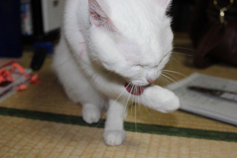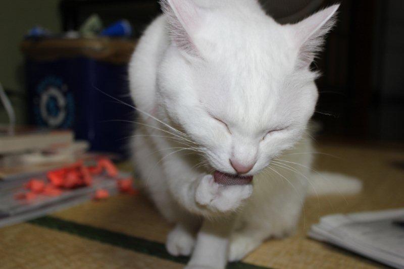 毛繕いの途中、手を近づけるとなめてくれる。