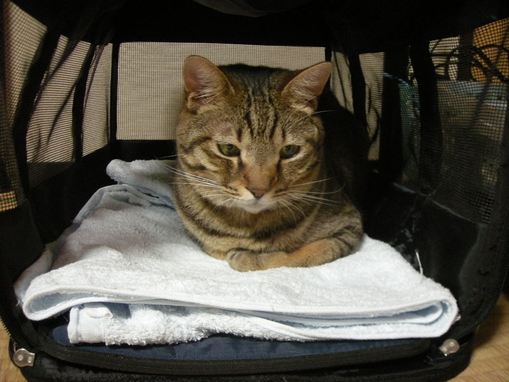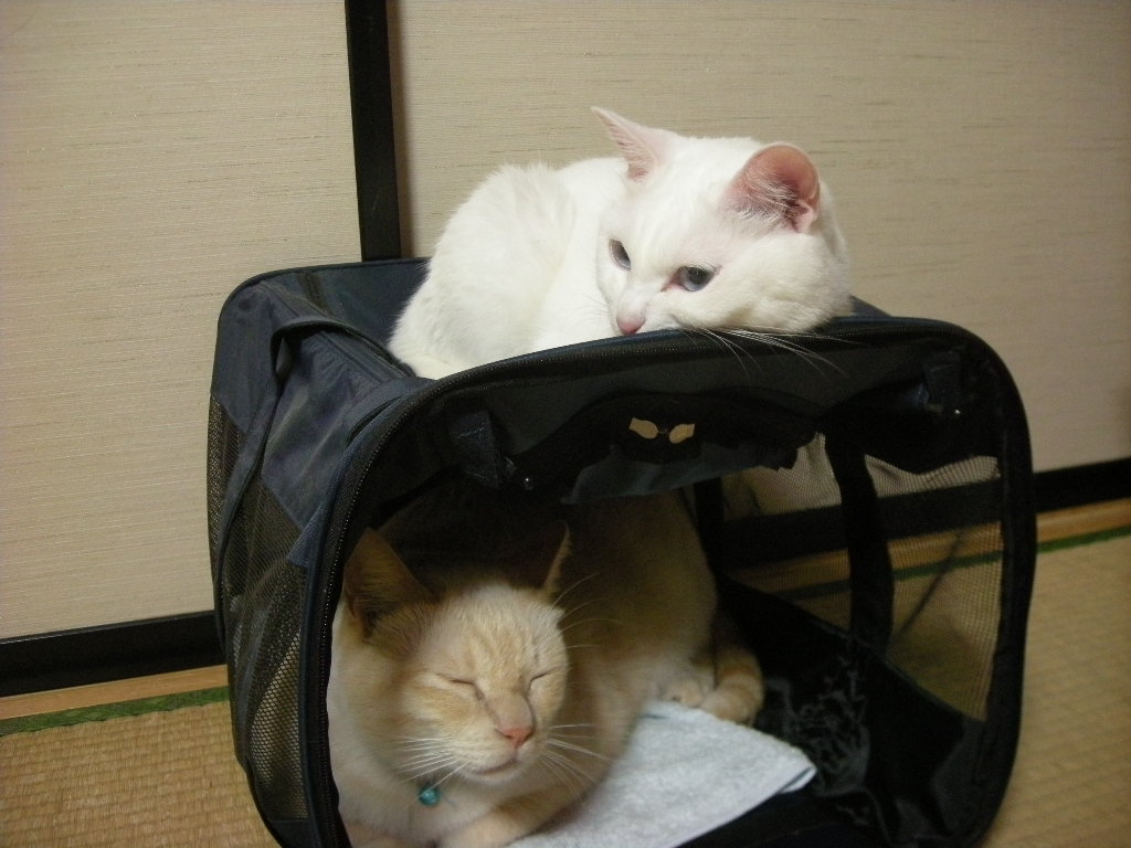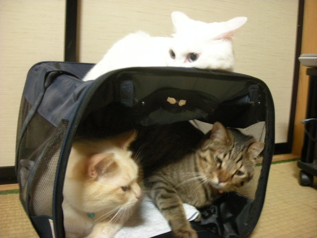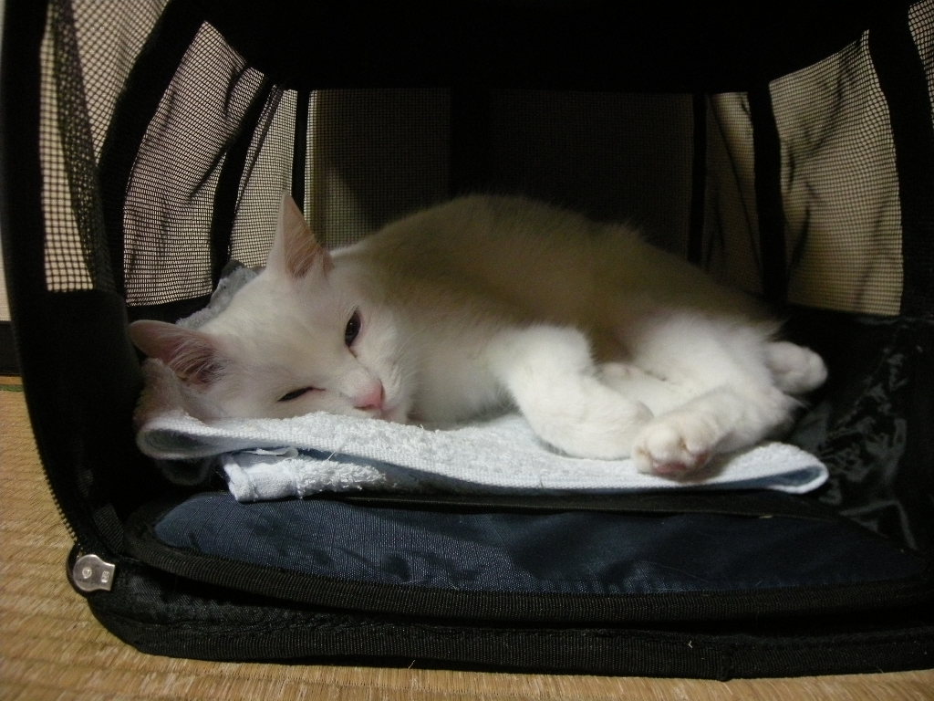 病院へ行くのに慣れさせようと置いておいたキャリーにはご機嫌なオーク