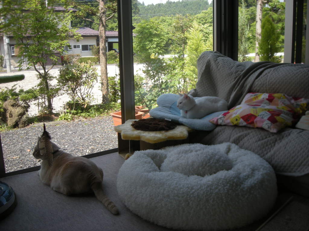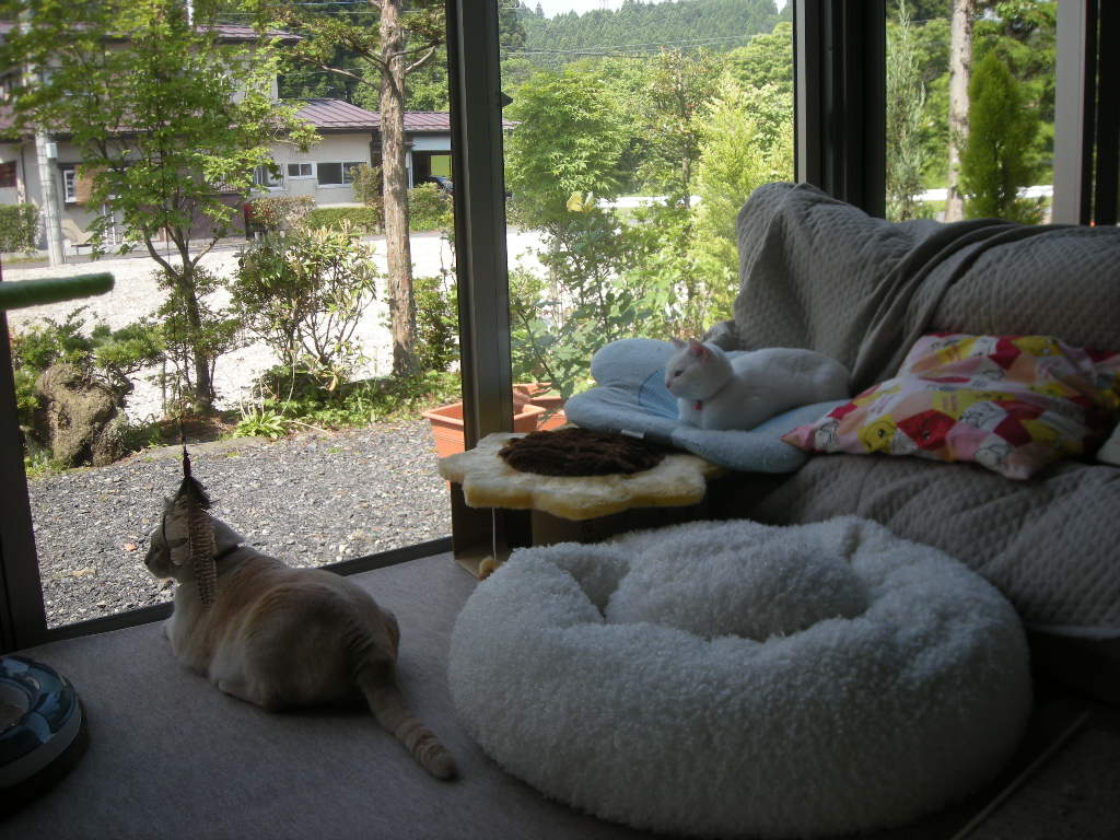 一番くつろいでる猫が地べたに座ります