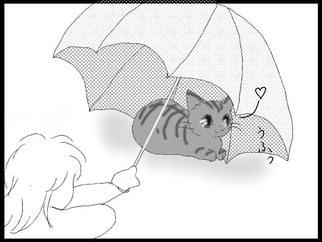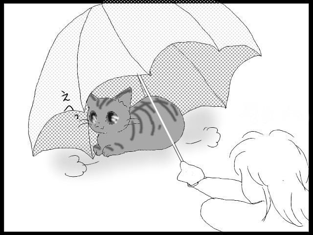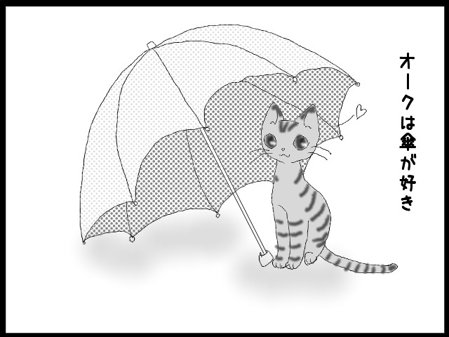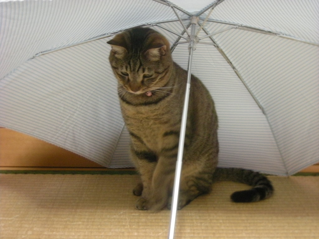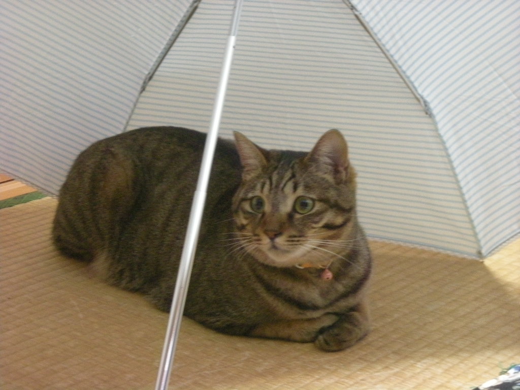 オークは傘が大好き。広げておくともれなく入ってくる。親ばか全開の悩殺ポーズだ。