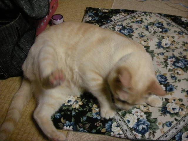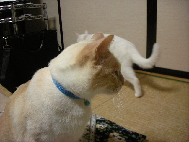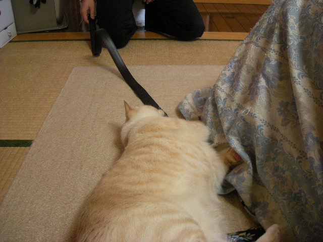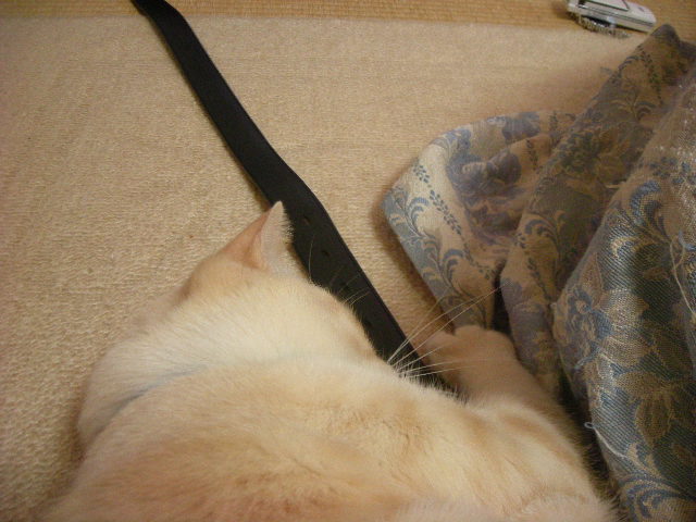 モカはベルトが丸まっていると怖いらしく、遠く避けていくのですが、どうやら、おもちゃとして遊んでくれるなら大丈夫らしい。