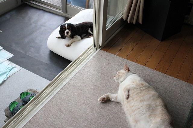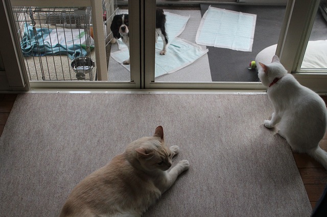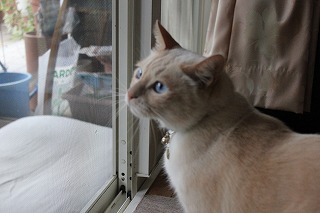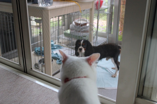 モカは家長として俄然立ち向かい、監視を怠りません。網戸越しにうなり声も上げます。ぶしつけににおいをかがれたので、果敢に猫パンチも繰り出しました。
