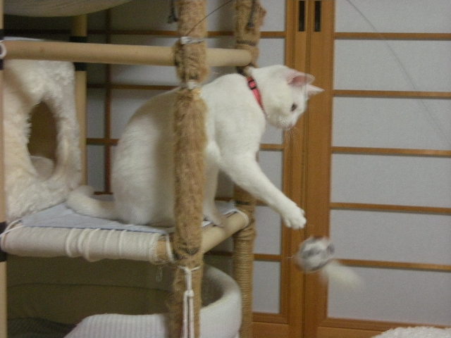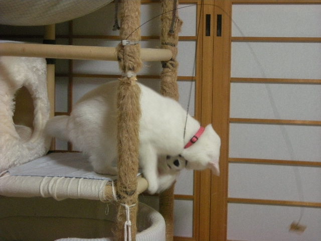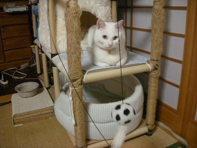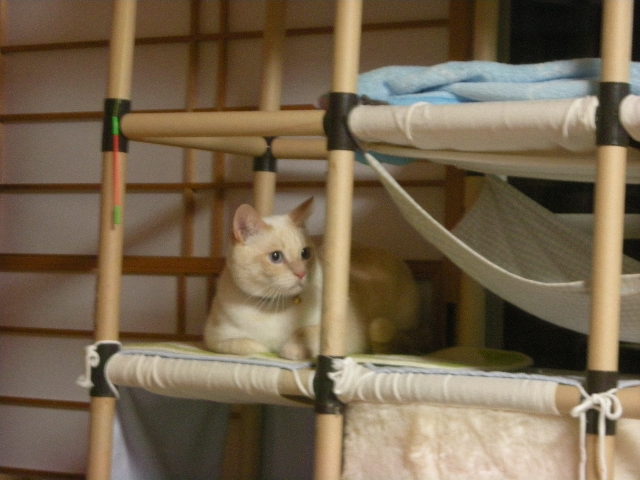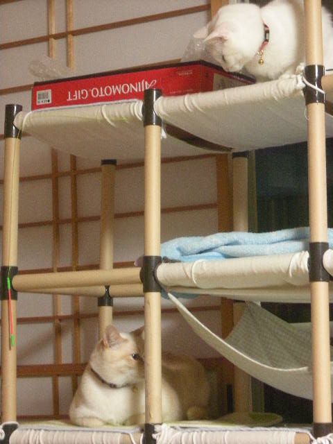 オークのためにと買ってきたにゃんこハウスが、まるであつらえたようにぴったりはまってしまったため、モカタワーの一部となってしまいました。