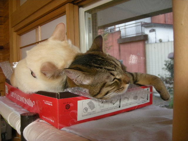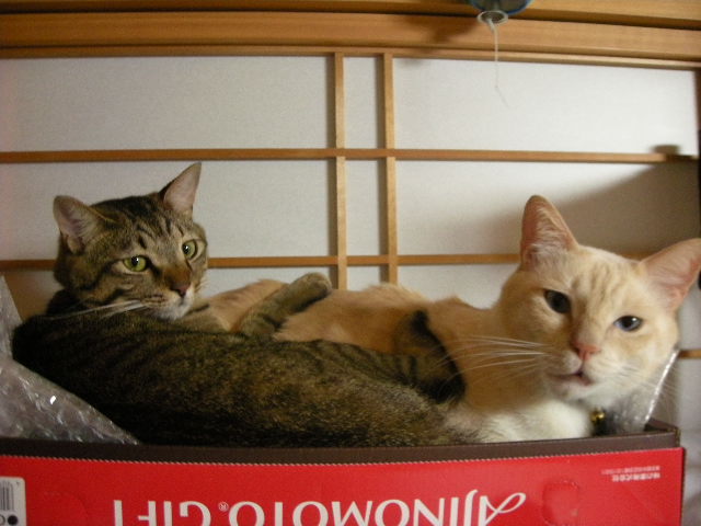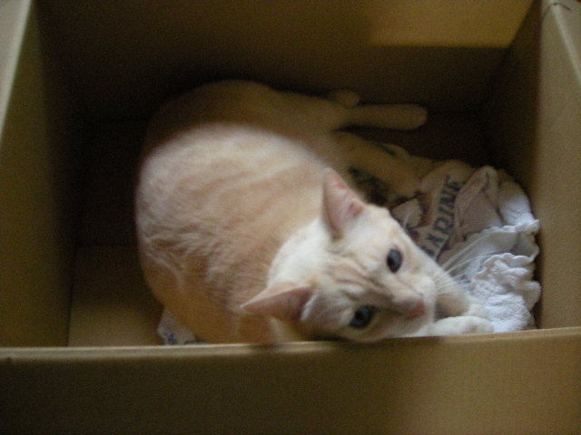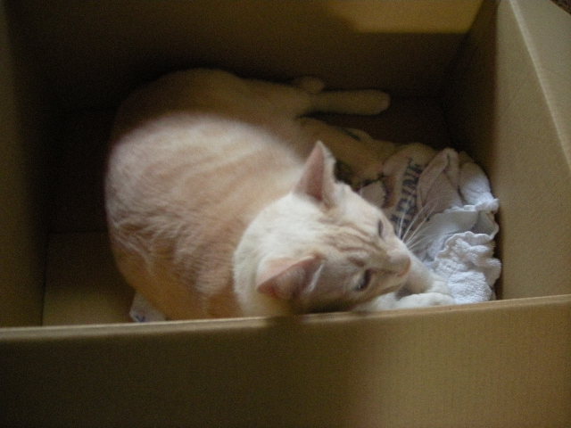 荷物を送るのに用意して置いた段ボールに入り込むモカ