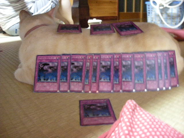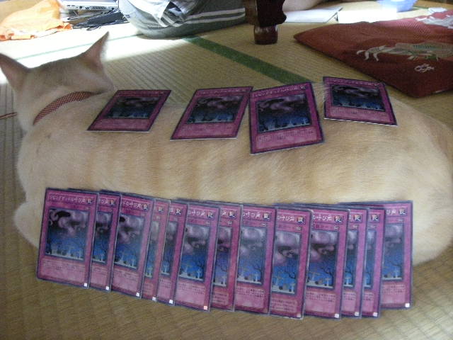 息子が大人買いした遊戯王カードです。モカに並べて悦に入ってます。