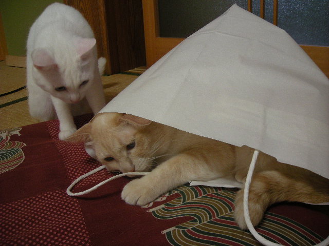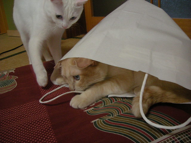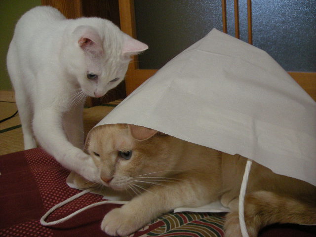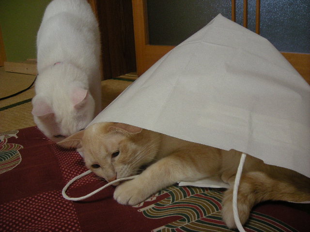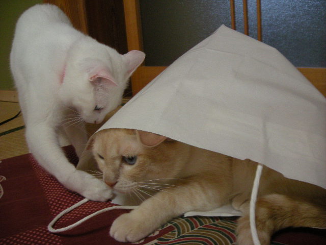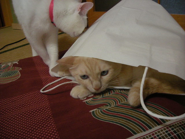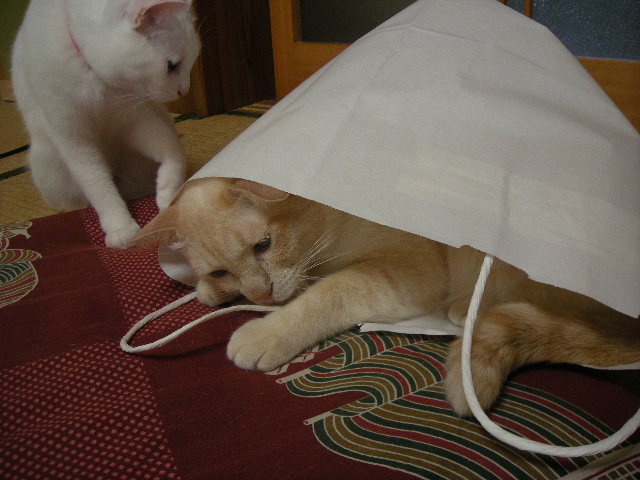 さんざん追いかけられて叱られることもあるんですが、今日のモカはご機嫌なのか、袋を出るつもりはないようです。