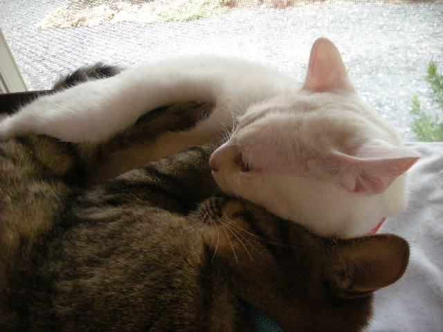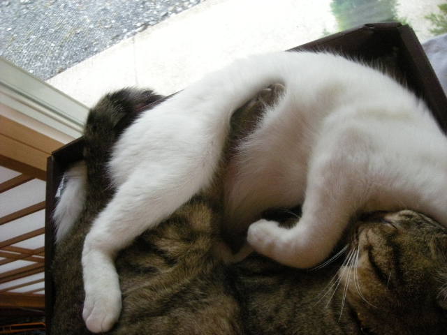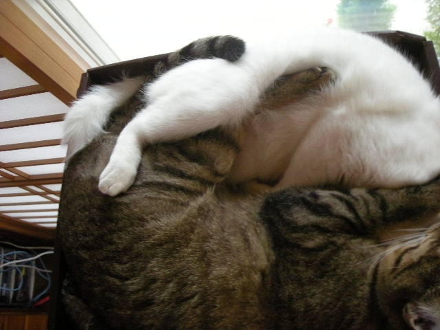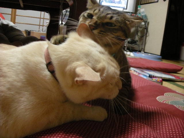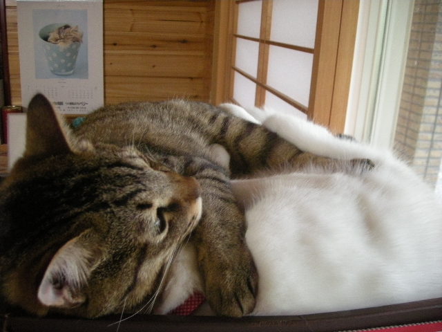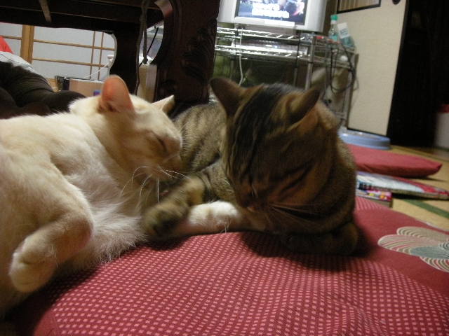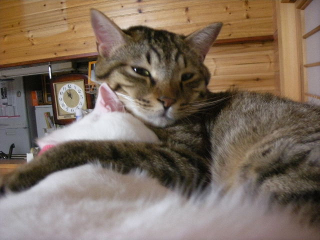 オーちゃん、アーちゃんの頭を枕にしちゃってるよ