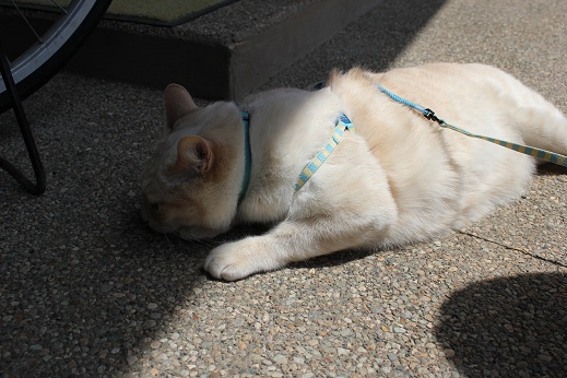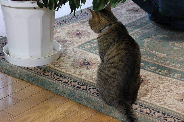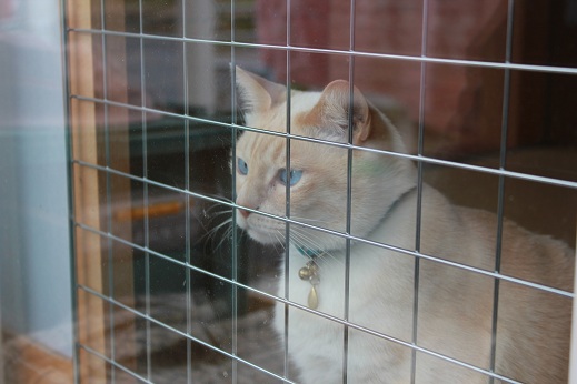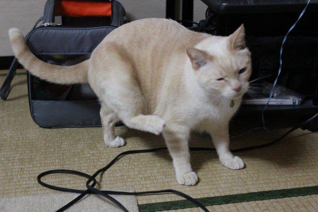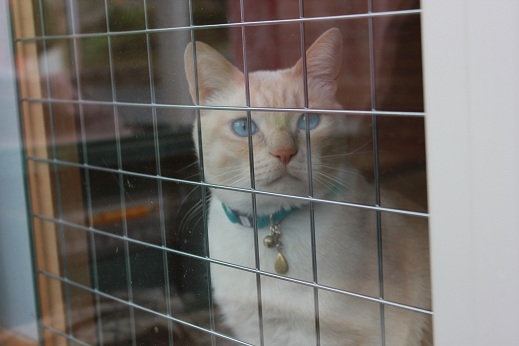モカは家長として俄然立ち向かい、監視を怠りません。網戸越しにうなり声も上げます。ぶしつけににおいをかがれたので、果敢に猫パンチも繰り出しました。