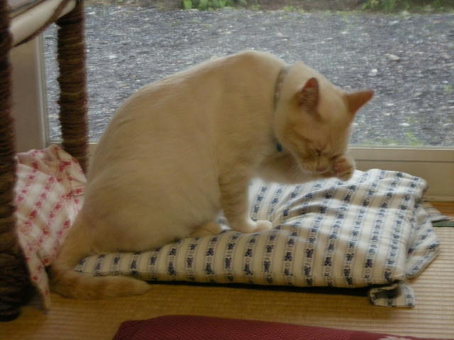 私は耳の間、おでこあたりのさわり心地も好きです。「猫のひたい」って狭い意味ですけど、キスしたりぐりぐりしたりするのに、何の支障もありません。