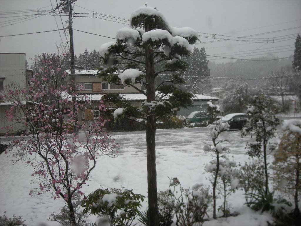 病院に向かう道で桜に積もった雪を写真に撮っている人がいました。