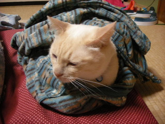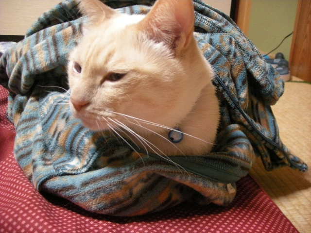 お母さんの座布団をとり、さらにお母さんのフリースもとってしまったモカ。